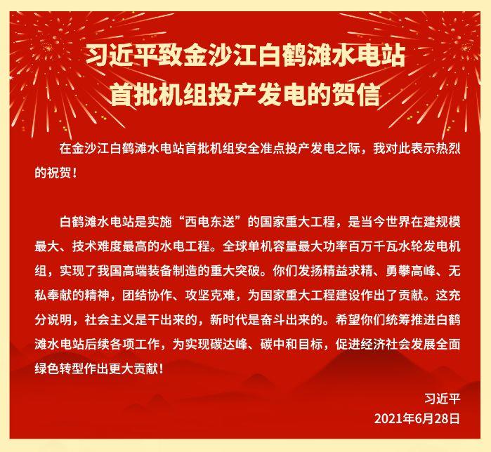 新華社北京6月28日電 金沙江白鶴灘水電站首批機組于28日安全準點投產發電。中共中央總書記、國家主席、中央軍委主席習近平發來賀信,表示熱烈的祝賀。